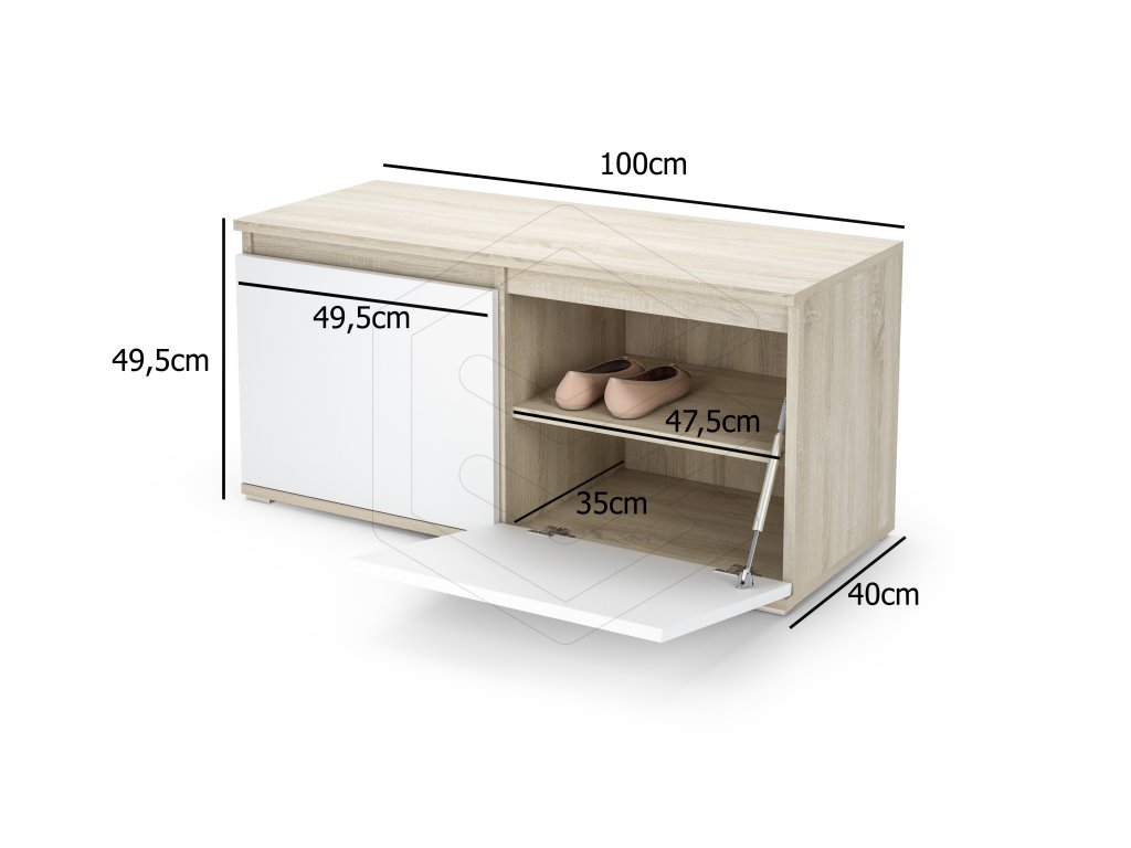 Rozměry botníku naleznete na poslední fotografii v galerii produktu. Dvířka botníku jsou opatřena plynovým pístem, který umožňuje plynulé a snadné otevírání a zavírání. |