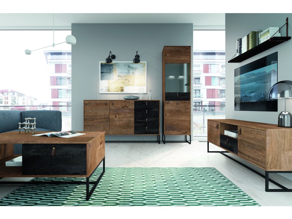 Každý kus nábytku z kolekce DARWIN je velice stabilní, jelikož je umístěn na vysokých kovových nohách v černé barvě. Korpus je vyroben z kvalitní laminované dřevotřísky o tloušťce 16 mm v kombinaci dvou dekorů - Dub Ribbeck/Černý kámen.