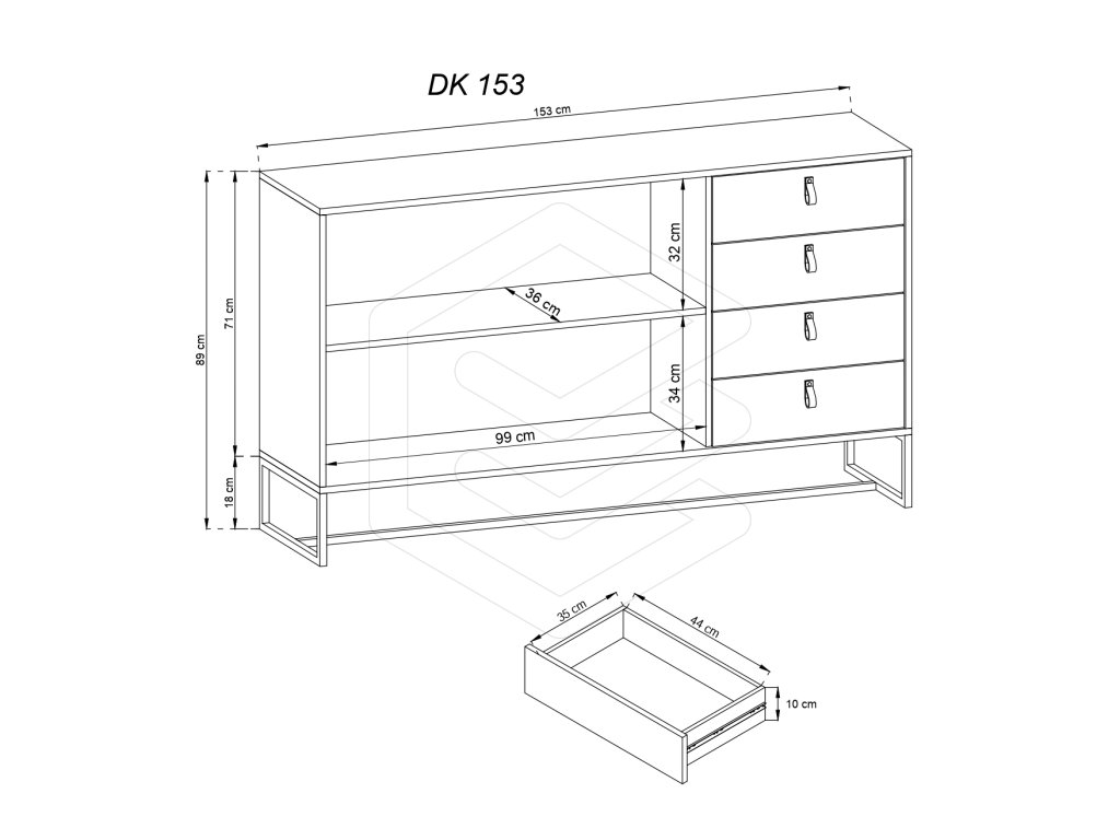 Komoda je široká 153 cm, nabízí praktický úložný prostor v podobě čtyř zásuvek a jedné uzavřené police.