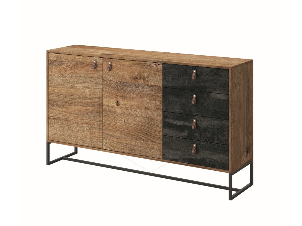 Elegantní komoda DARWIN D-03 ze stejnojmenné kolekce nábytku v kombinaci dvou dekorů Dub Ribbeck/Černý kámen s koženými úchytky s mosazným kováním dodá interiéru atraktivní vzhled.