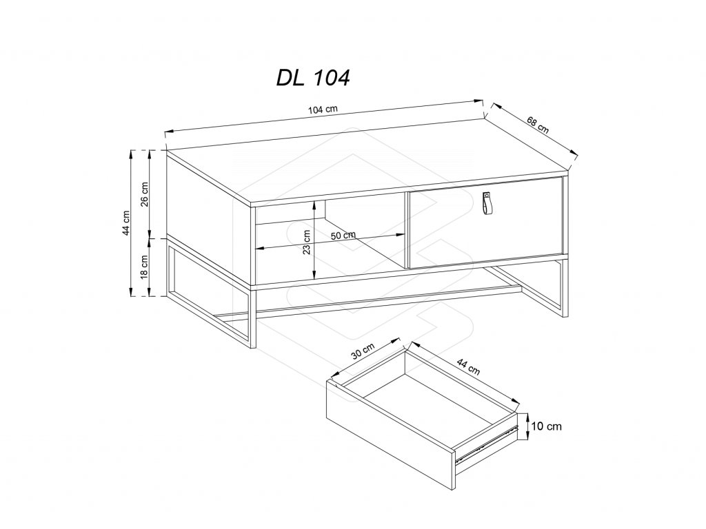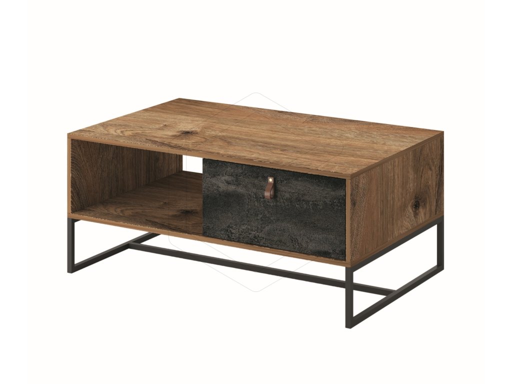 Konferenční stolek čtvercového tvaru je široký 104 cm, nabízí praktický úložný prostor v podobě jedné zásuvky a otevřené police.