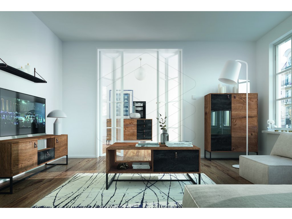 Každý kus nábytku z kolekce DARWIN je velice stabilní, jelikož je umístěn na vysokých kovových nohách v černé barvě. Korpus je vyroben z kvalitní laminované dřevotřísky o tloušťce 16 mm v kombinaci dvou dekorů - Dub Ribbeck/Černý kámen.