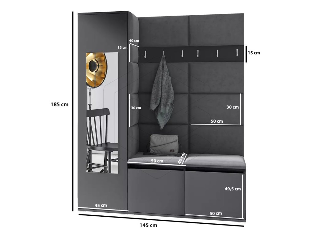 Přinášíme Vám dokonalou předsíňovou stěnu s moderním a estetickým designem pro Váš domov, která je kompletní s věšáky a botníkem. Tato stěna je rovněž vybavena čalouněnými panely na zadní straně, které nejen dokonale doplňují celkový vzhled, ale také představují zcela nový prvek na českém trhu.