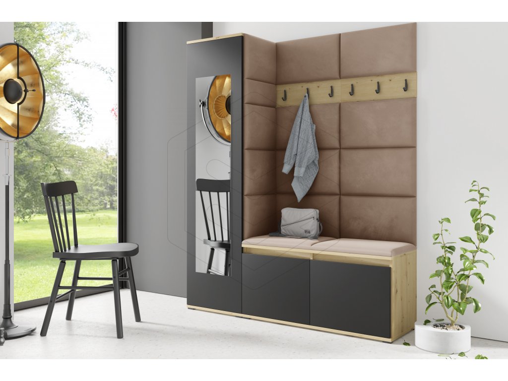 Přinášíme Vám dokonalou předsíňovou stěnu s moderním a estetickým designem pro Váš domov, která je kompletní s věšáky a botníkem. Tato stěna je rovněž vybavena čalouněnými panely na zadní straně, které nejen dokonale doplňují celkový vzhled, ale také představují zcela nový prvek na českém trhu.